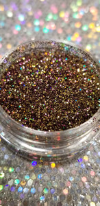 An array of ultra fine/fine loose glitters/mixes, multi chrome powders, and metallic foil flakes in a 3g pot.